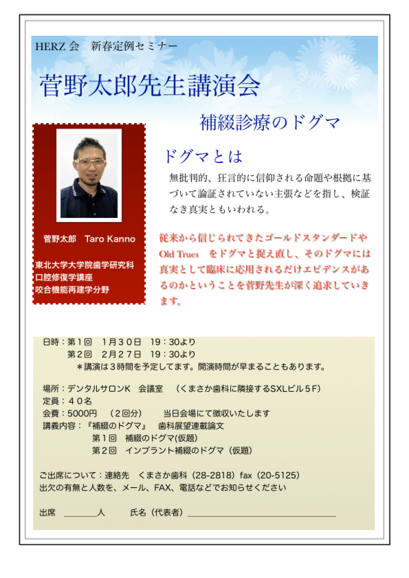 2013年1月2月 菅野先生来八 HERZ会会場で夕方から講演会を開催します。